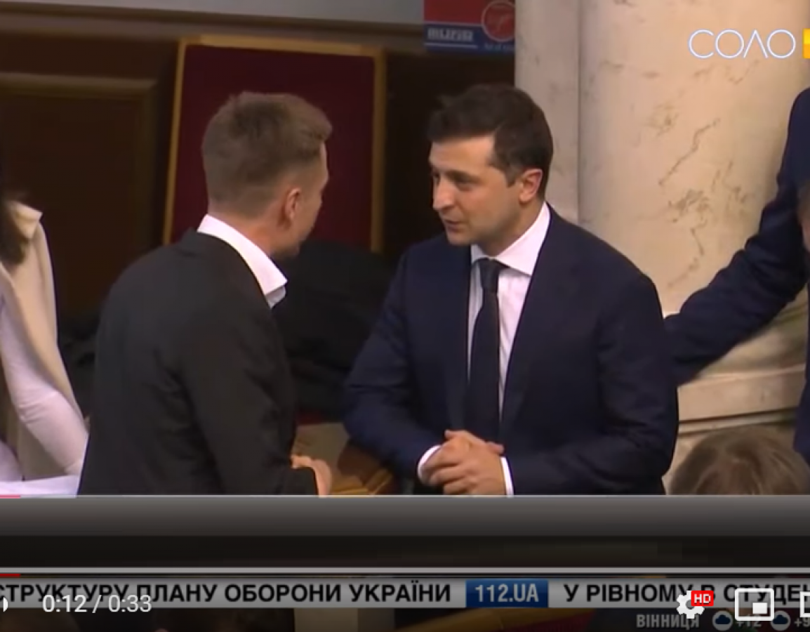 Зеленский отказался от рукопожатия характерным жестом левой руки и в течение нескольких секунд что-то упорно пояснял депутату.