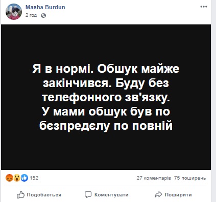 "Я в норме. Обыск почти закончился. Буду без телефонной связи. У мамы обыск был по беспределу по полной", - заявила волонтер.