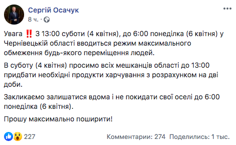 Власти Буковины прибегли к жестким мерам для сдерживания эпидемии китайского коронавируса. Глава Черновицкой области Сергей Осачук на своей странице в Facebook анонсировал введение "режима максимального ограничения".