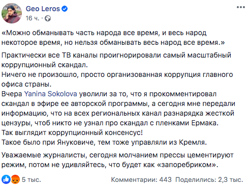 Сам Лерос прокомментировал остановку "Как вам не стыдно" на своей странице в Facebook. Он уверяет, что украинским телеканалам "пришла разнарядка" игнорировать скандал с "пленками Ермака".