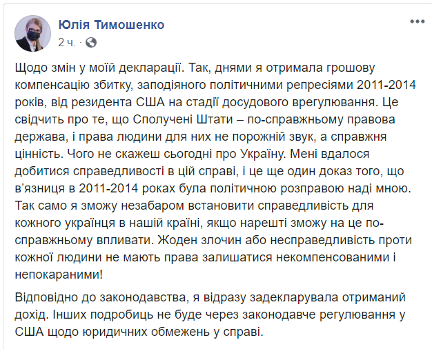 На своей странице в социальной сети Facebook Тимошенко сообщила, что действительно на задекларировала почти 150 млн гривен, которые получила в качестве денежной компенсации ущерба, причиненного политическими репрессиями 2011-2014 годов.