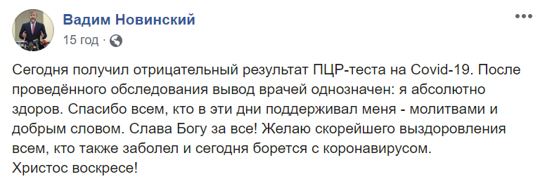 Теперь же Новинский заявляет, что окончательно излечился от вируса: результаты тестов, по его словам, оказались отрицательными. Кроме того, политик поблагодарил всех, кто оказывал ему поддержку.