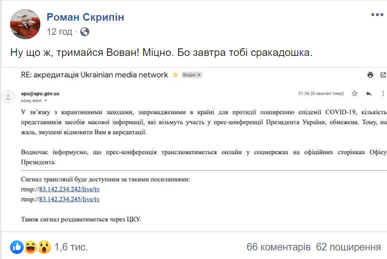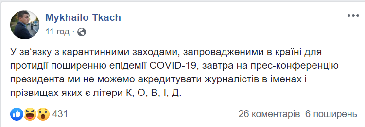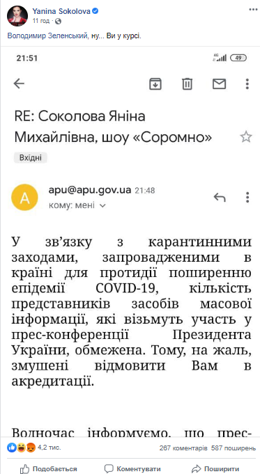 Пресс-служба Офиса президента Украины под предлогом коронавируса решила не пускать на публичное мероприятие корреспондентов ряда украинских и иностранных средств массовой информации, а также отдельных блогеров и журналистов Янину Соколову и Романа Скрыпина. В то же время сотрудники изданий Анатолия Шария получили доступ на конференцию.