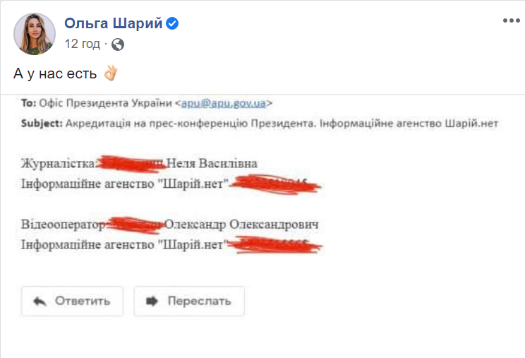 Тем не менее, все же нашлись люди, которым Офис Президента предоставил доступ на пресс-конференцию: это корреспонденты издания "Шарий.NET". Об этом главред данного СМИ Ольга Шарий сообщила на своей странице в "Фейсбук".