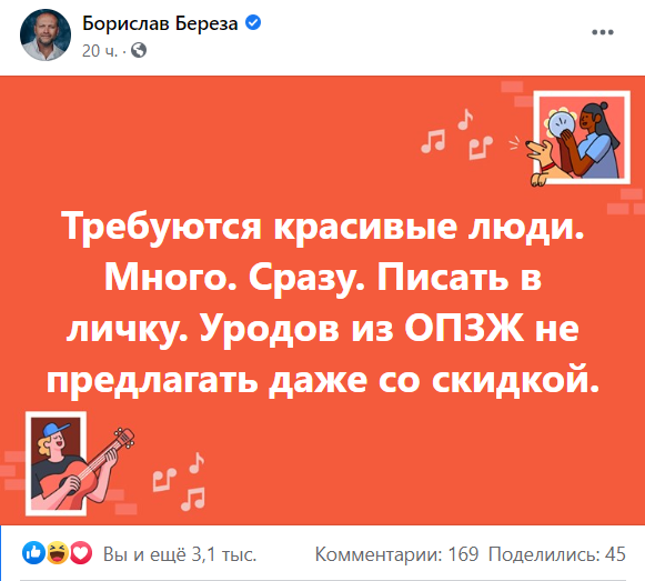 "Требуются красивые люди. Много. Сразу. Писать в личку. Уродов из ОПЗЖ не предлагать даже со скидкой", - ответил он ей.
