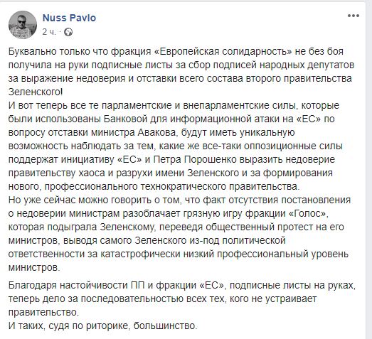 "И вот теперь все те парламентские и внепарламентские силы, которые были использованы Банковой для информационной атаки на "ЕС" по вопросу отставки министра Авакова, будут иметь уникальную возможность наблюдать за тем, какие же все-таки оппозиционные силы поддержат инициативу "ЕС" и Петра Порошенко", - написал эксперт.