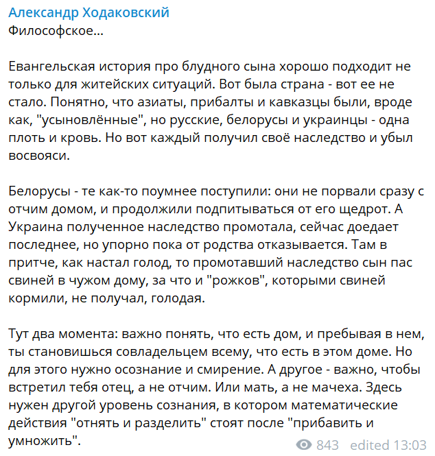 "Белорусы - те как-то поумнее поступили: они не порвали сразу с отчим домом и продолжили подпитываться от его щедрот. А Украина полученное наследство промотала, сейчас доедает последнее, но упорно пока от родства отказывается. Там в притче, как настал голод, то промотавший наследство сын пас свиней в чужом дому, за что и "рожков", которыми свиней кормили, не получал, голодая", - пишет Ходаковский.