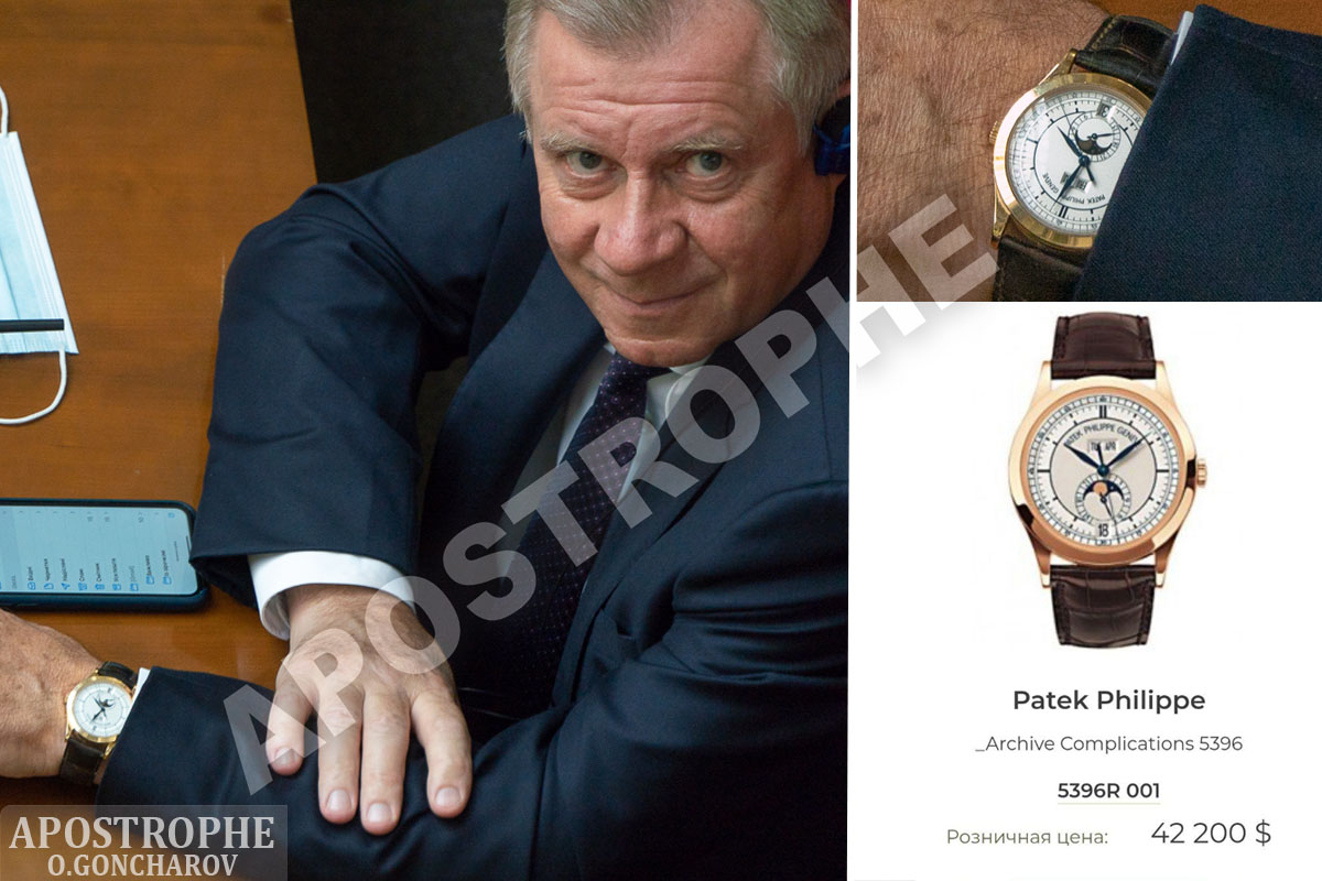 В день, когда парламент голосовал за отставку главы НБУ, на руке у Смолия увидели дорогие наручные часы марки Patek Philippe Geneve. Стоимость этих часов составляет 42 тысячи долларов.