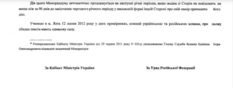 Данный документ был подписан в Ялте 12 июля 2012 года Кабинетом министров Украины и правительством Российской Федерации, срок его действия продолжался в течение 8 лет.