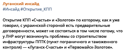"Открытие КПП "Счастье" и "Золотое"... может не состояться в том числе потому, что у "ЛНР" могут возникнуть проблемы со строительством инфраструктуры ППТК", - сообщил ресурс.
