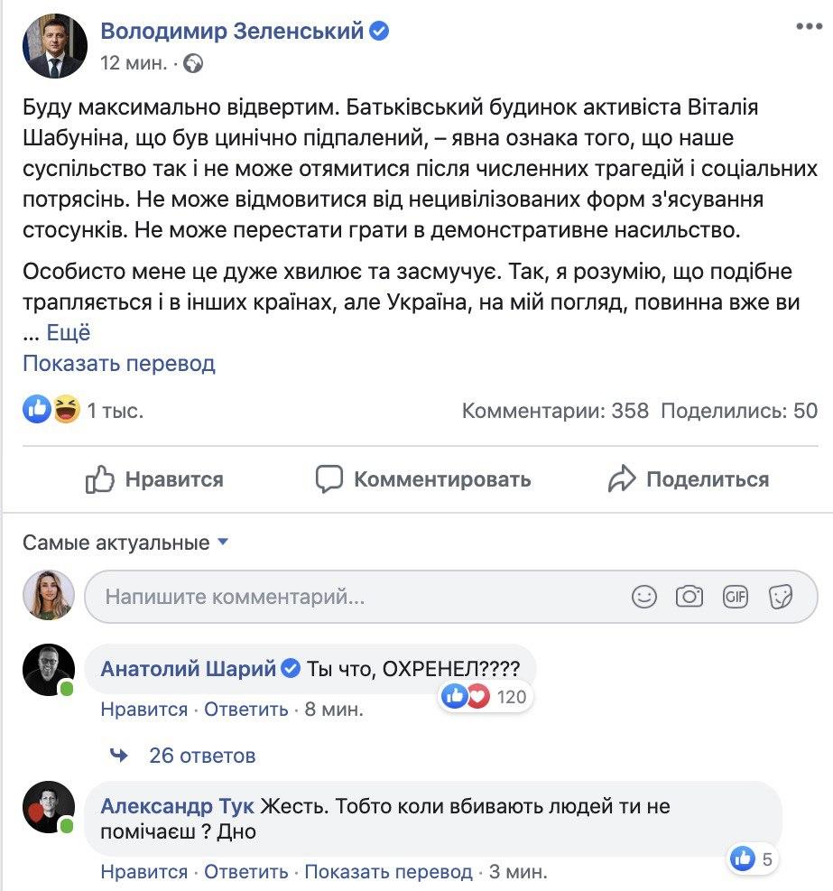 Зеленский сделал заявление на своей странице в социальной сети Facebook, куда в комментарии пришел Шарий и обратился к украинскому президенту со словами: "Ты что, ОХР**ЕЛ????"