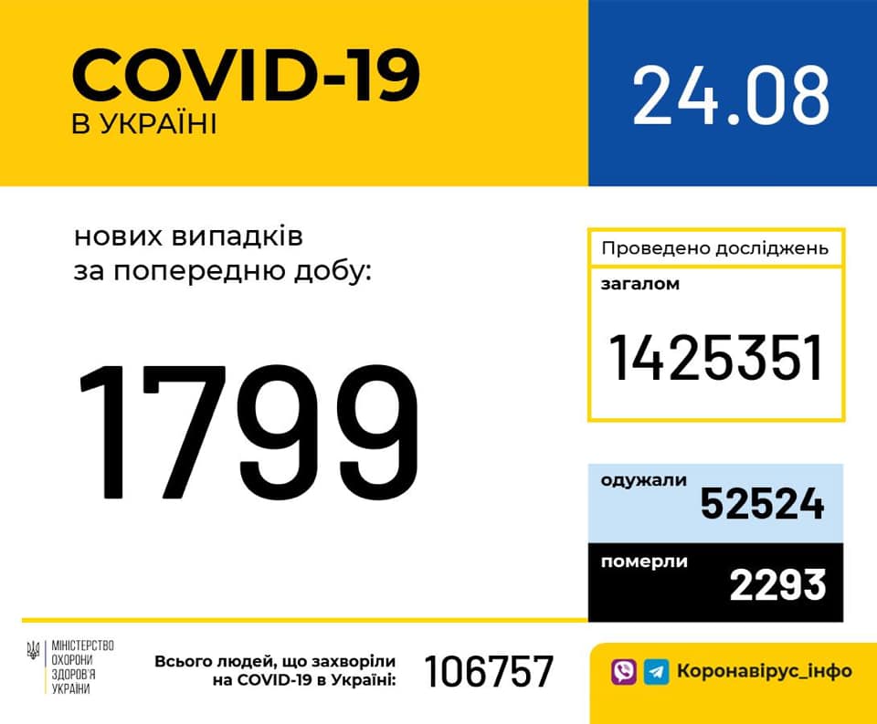 По состоянию на понедельник, 24 августа, в Украине насчитывают 106 757 случаев коронавируса. Только за минувшие сутки добавилось на 1 799 инфицированных.