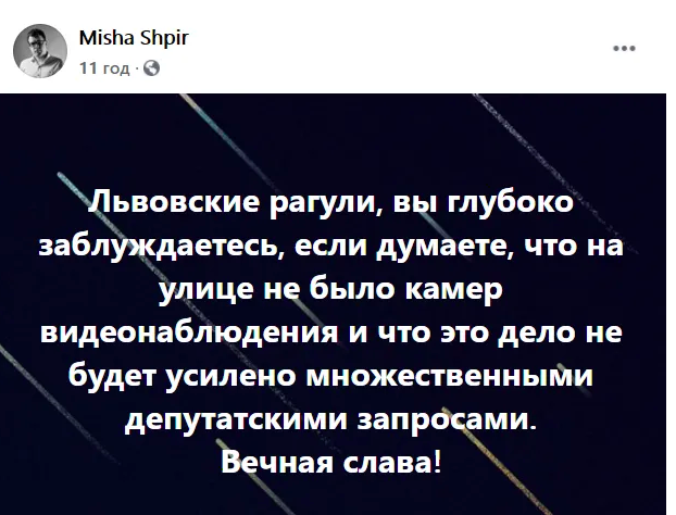 Шпир в итоге разразился обвинениями. Он назвал "львовскими раг***ми" парней, которые на него напали. Кроме того, мужчина уверял, что у него имеются записи камер наблюдения и пригрозил ответственностью с "многочисленными депутатскими запросами".