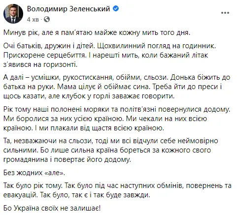 На своей странице в соцсети Зеленский не только вспомнил этот день, но и опубликовал видео про момент освобождения. Президент отметил, что помнит почти каждое мгновение того самого дня, когда пленники вернулись в Украину, а родственники, журналисты и чиновники Офиса президента встречали их на украинской земле.