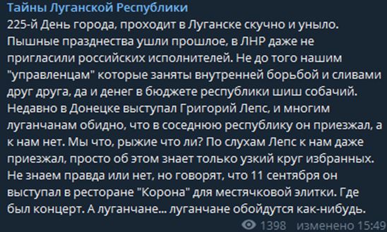 В отличие от предыдущих Дней города, в Луганске 12 сентября текущего года не будет концертов российских артистов. Однако, по некоторым данным, 11 сентября в город приезжал Григорий Лепс, который незадолго до того пел в Донецке, но не для того, чтобы спеть для горожан, а для выступления перед верхушкой оккупационной "власти", праздновавшей в ресторане "Корона". Простые луганчане довольствовались выступлениями местных талантов.