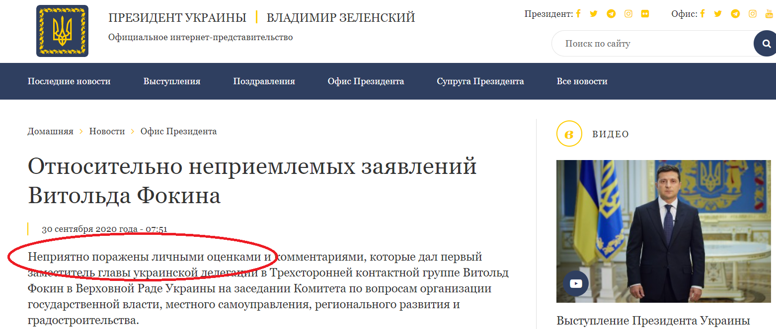 Президент Владимир Зеленский вмешался в скандал с заявлениями члена украинской делегации в ТКГ Витольда Фокина. Глава государства остался "неприятно поражен" заявлениями и собственными оценками, которые он позволил себе сделать публично.