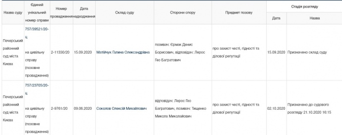 Отмечается, что суд по иску Ермака пройдет по сокращенной процедуре, а дело от Тищенко планируют рассмотреть в суде 21 октября. При этом из-за карантина может произойти перенос дела.