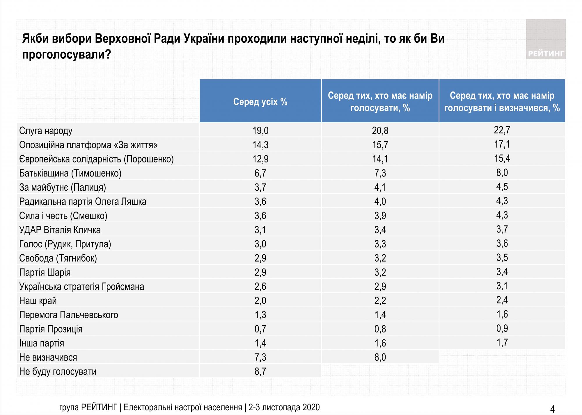 В случае проведения выборов в Парламент в ближайшее воскресенье проходной барьер преодолевают только 4 партии. Об этом сообщают информационные агентства со ссылкой на опубликованные данные соцгруппой "Рейтинг".