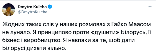 "Я напротив за то, чтобы дать Беларуси дышать свободно", - констатировал Кулеба.