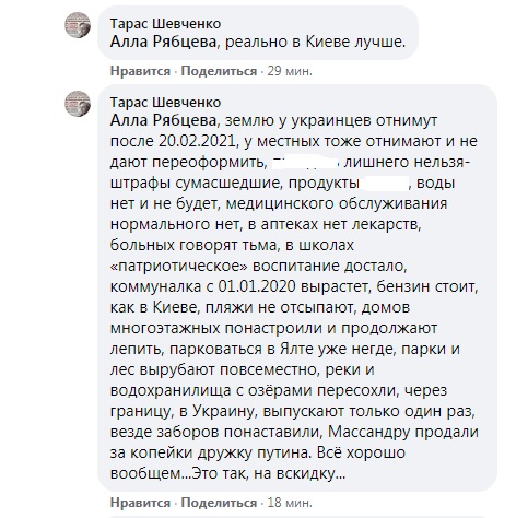 "Реально в Киеве лучше… Землю у украинцев (в Крыму) отнимут после 20.02.2021. У местных тоже отнимают и не дают переоформить. Говорить лишнего нельзя, штрафы сумасшедшие, продукты — дрянь, воды нет и не будет, медицинского обслуживания нормального нет, в аптеках нет лекарств, больных тьма, в школах «патриотическое» воспитание достало, коммуналка с 01.01.2021 вырастет", - пишет крымчанин.