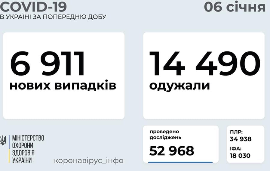 По состоянию на 6 января в Украине насчитывают 1 090 496 случаев коронавируса. Только за минувшие сутки добавилось 6 911 инфицированных.
