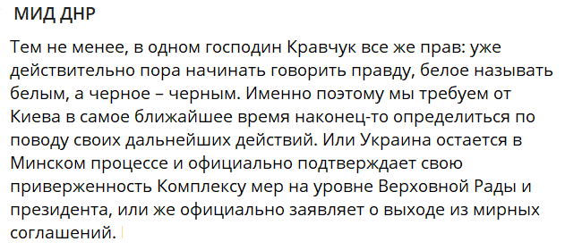 Боевики "ДНР" требуют со стороны властей Украины сделать официальное заявление и прокомментировать призывы Леонида Кравчука открыть огонь на поражение российских военных на Донбассе после того, как оккупанты обстреливают позиции ВСУ, сообщает Диалог.UA.