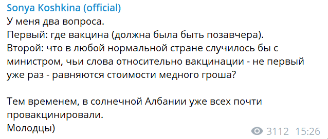 "Тем временем в солнечной Албании уже всех почти провакцинировали. Молодцы)", - пишет она.