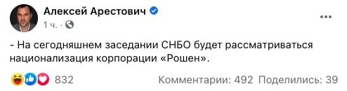 Советник главы ОП написал, что на заседании Совета национальной безопасности и обороны Украины сегодня, 19 февраля, будет рассматриваться вопрос о национализации компании "Рошен", которая принадлежит Порошенко.