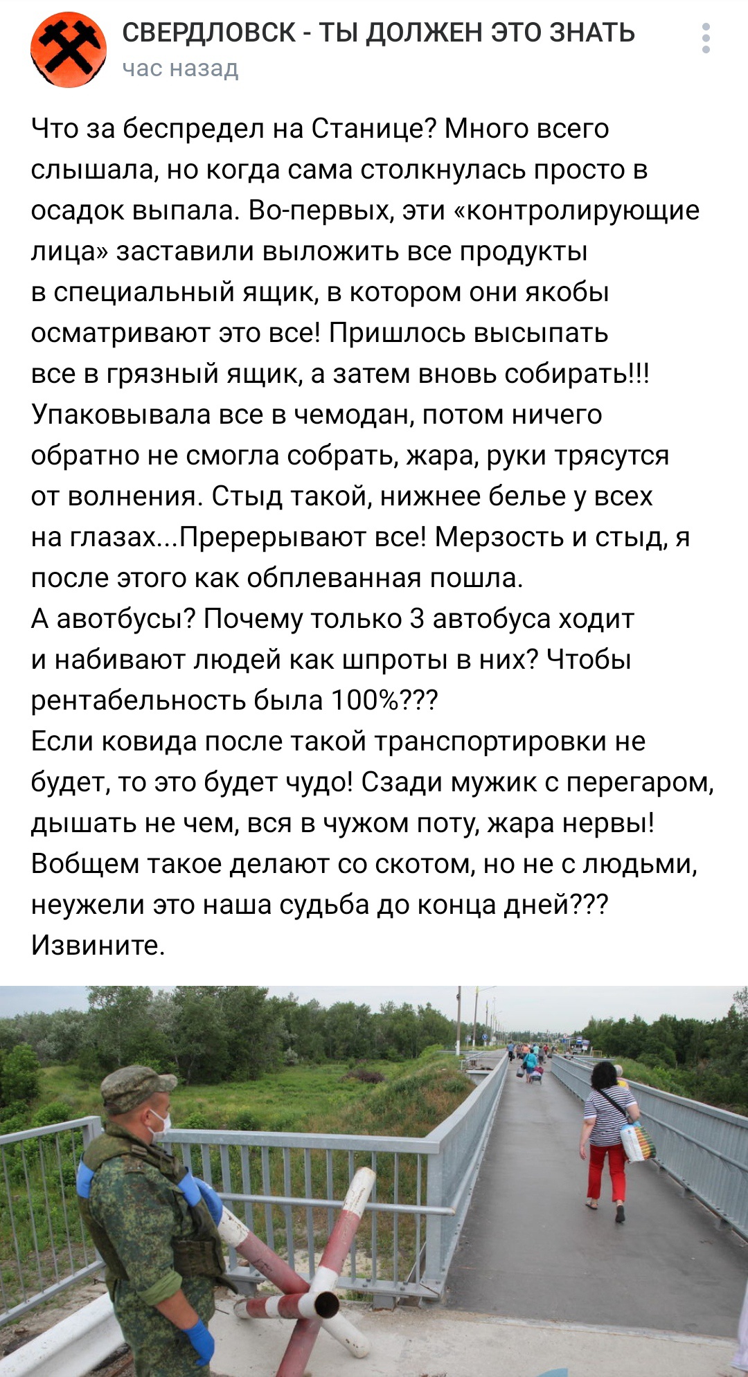 "Что за беспредел на Станице? (...) Эти "контролирующие лица" (наемники РФ - ред.) заставили выложить все продукты в специальный грязный ящик, а потом собирать это все. Упаковывала все в чемодан, потом обратно ничего не смогла собрать - жара, рук трясутся от волнения. Стыд такой - нижнее белье у всех на глазах. Перерывают все! Мерзость и стыд. Я после как оплеванная шла", - пожаловалась женщина.