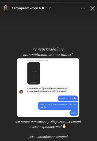 В своих сторис в Instagram Пренткович опубликовала скрины переписки с одной из подписчиц, где блогер утверждала, что отдала 4,5 миллиона гривен личных расходов на ВСУ, потребовав "не перекладывать ответственность на других". Кроме этого, она уверяет, что, несмотря на колоссальные убытки в первый год полномасштабной войны, не сокращала персонал.