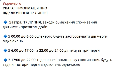 Ситуация в энергосистеме Украины, подорванной атаками РФ, остается очень тяжелой. В среду, 17 июля, отключения электричества будут действовать по всей стране и целые сутки.