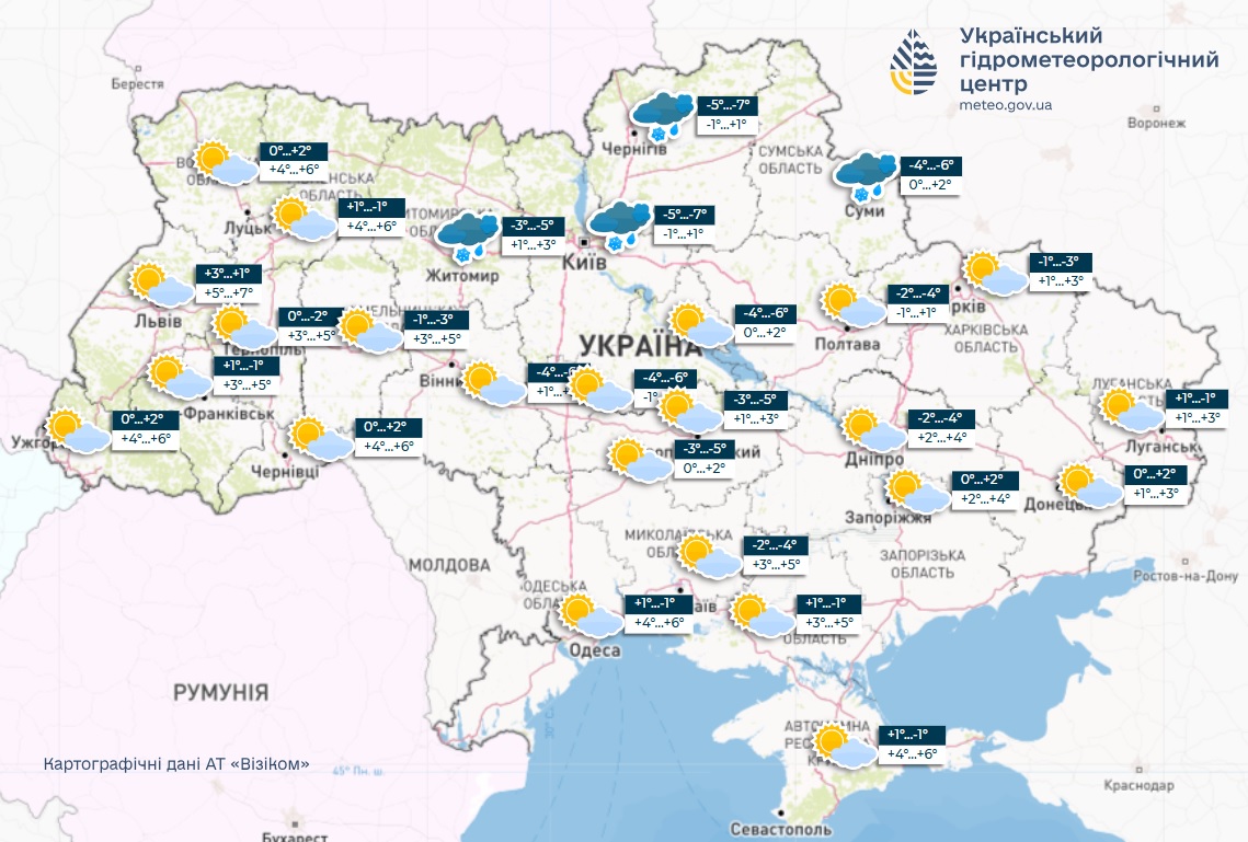 Днем в среду температура в Украине будет колебаться в пределах -2...+4°C, в западных областях ожидается +4...7°C, на Закарпатье и в южной части Крыма до +7...9°C.
