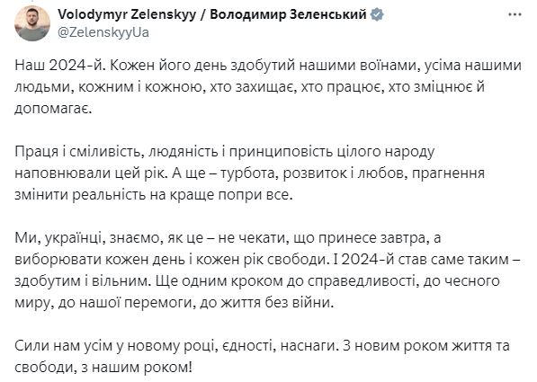 Мы, украинцы, знаем, как это – не ждать, что принесет завтра, а бороться каждый день и каждый год свободы. И 2024-й стал именно таким – добытым и свободным. Еще одним шагом к справедливости, к честному миру, к нашей победе, к жизни без войны.