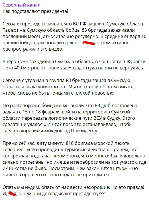 "В Сумскую область бойцы 83-й бригады захаживали последний месяц относительно регулярно. В середине января 10 наших бойцов там попали в плен, (украинцы - ред.) потом активно распространяли это видео. Вчера (18 февраля - ред.) тоже заходили… в Журавку, это 400 метров от границы. Назад оттуда парни не вернулись. Сегодня (19 февраля - ред.) с утра наша группа 83-й бригады зашла в Сумскую область и была уничтожена", - написал российский ресурс.