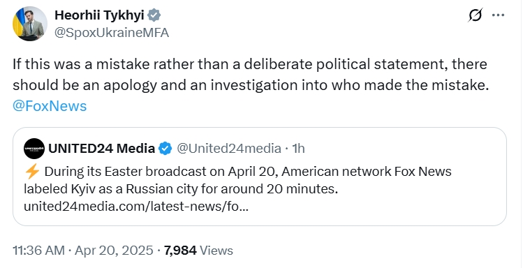 Спикер МИД Украины Георгий Тихий потребовал публичных извинений от телеканала FoxNews, который обозначил Киев как город России.