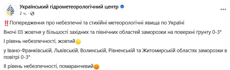 Тем временем синоптики Укргидрометцентра предупреждают об опасных метеорологических явлениях в ночь на 3 октября, которые ожидаются в западных и северных областях. Речь идет о заморозках.