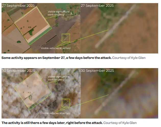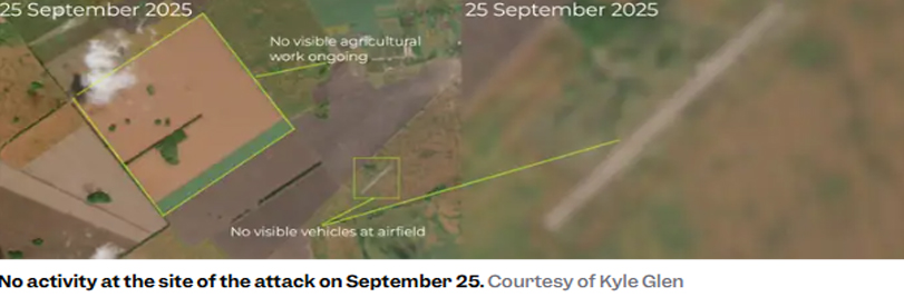 На снимках от 27-30 сентября в районе удара шли сельскохозяйственные работы, поэтому колонна грузовых фур выглядит вполне правдоподобно.