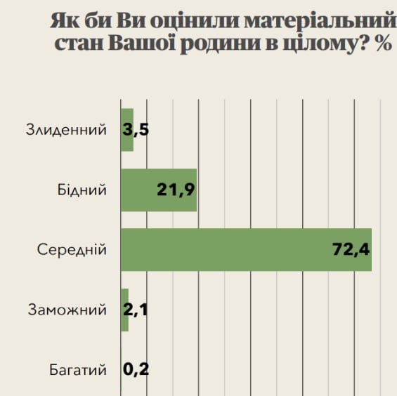 При этом 21,9% украинцев считают себя бедными, а еще 3,5% охарактеризовали свое финансовое положение как нищенское. На противоположном полюсе находятся лишь 2,1% тех, кто ощущает себя зажиточными, и всего 0,2%, кто осмелился назвать себя богатыми.