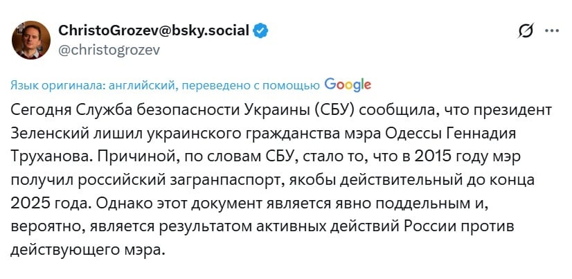 Журналист-расследователь Христо Грозев прокомментировал ситуацию в своём X-аккаунте (Twitter). Он отметил, что представленный российский паспорт "демонстративно фейковый" и, по всей видимости, является информационной операцией России против действующего мэра Одессы.