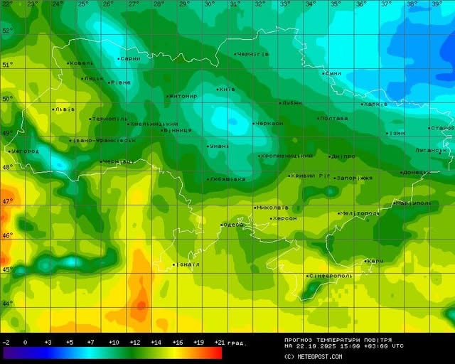 В среду, 22 октября, самая тёплая погода ожидается в южных и западных областях Украины, днем +12…16 °C. Лишь Ровненщина проявит свой характер. Там температура не поднимется выше +8…11 °C. На остальной территории страны (от центра до северо-востока) днём прогнозируется +7…12 °C, ночью местами возможны заморозки при прояснениях.