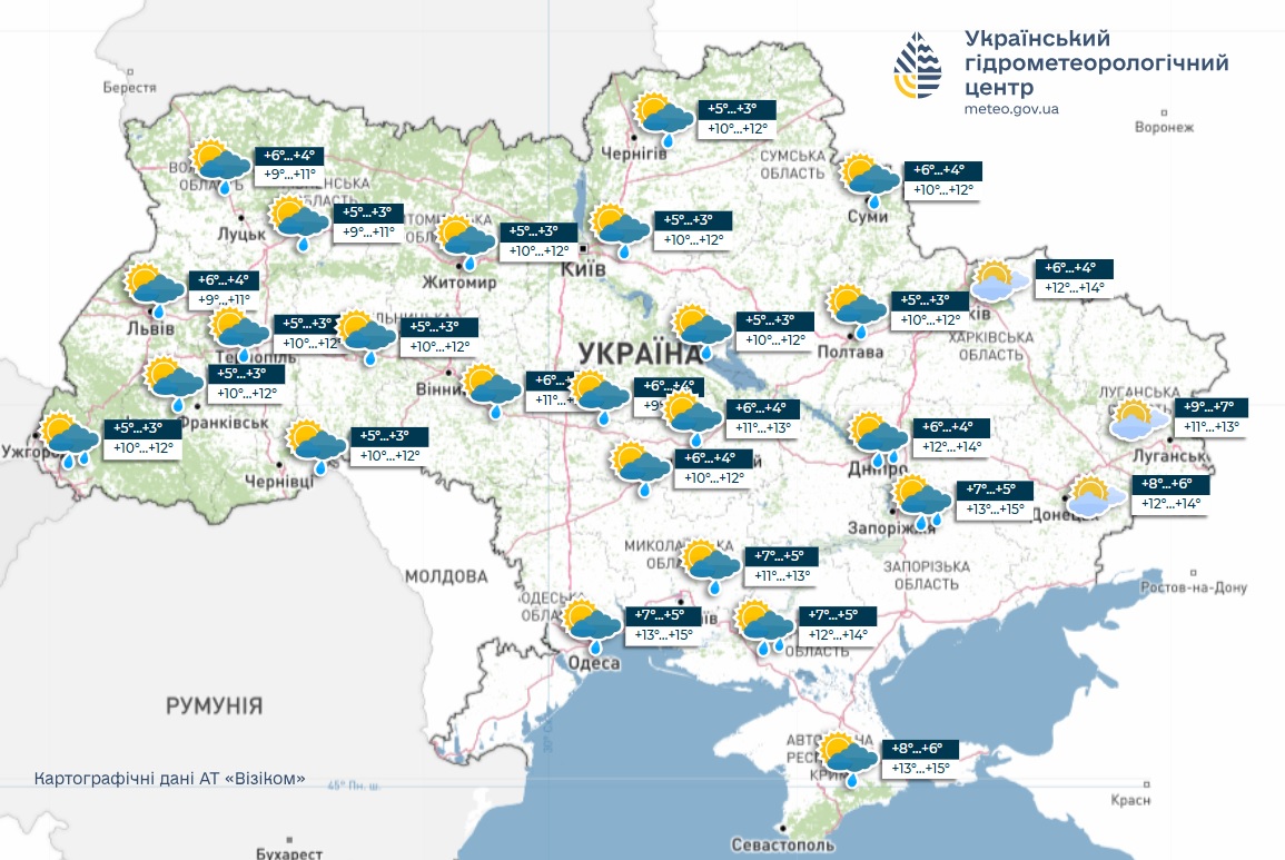 Температура во вторник поднимется до +15 градусов, особенно на юге Украины, дожди ожидаются в восточных и южных областях, остальная часть страны без осадков.