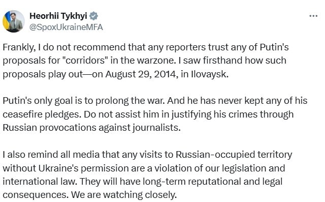 В МИД Украины, реагируя на эти заявления оккупантов, обратились к иностранным журналистам, призвав их не верить обещаниям кремлевского диктатора и напомнив о российском "коридоре" в Иловайске в 2014 году, когда враг нарушил данные обещания и открыл огонь по "зеленому коридору", по которому выходили украинские военные. Об этом спикер ведомства Георгий Тихий написал в соцсети Х.