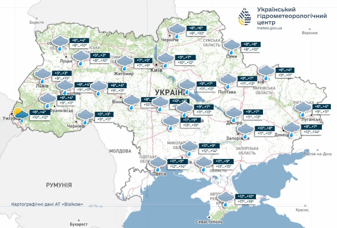 Запад: +8…12 °C, дожди, на Закарпатье местами прояснения.