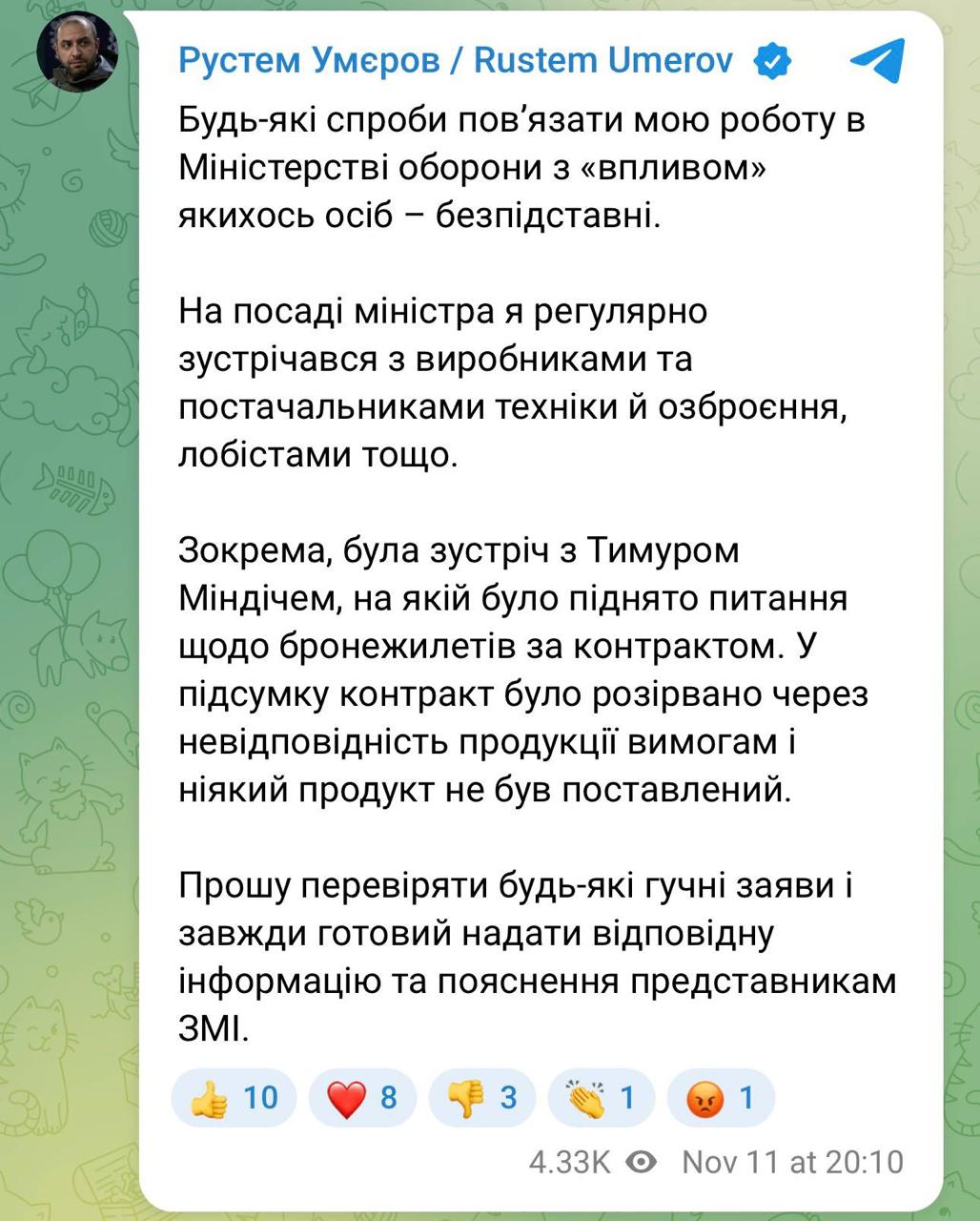 Кроме того, Миндич оказывал влияние на бывшего министра обороны Рустема Умерова, что указывает на масштабное проникновение бизнесмена в ключевые сферы власти.