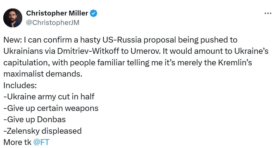 В свою очередь, журналист Financial Times Кристофер Миллер пишет в соцсети X, что план разработанный спецпредставителем президента США Стивом Уиткоффом и переговорщиком от Кремля Кириллом Дмитриевым предусматривает "отказ Украины от Донбасса, сокращение украинской армии вдове и отказ от определенного оружия".