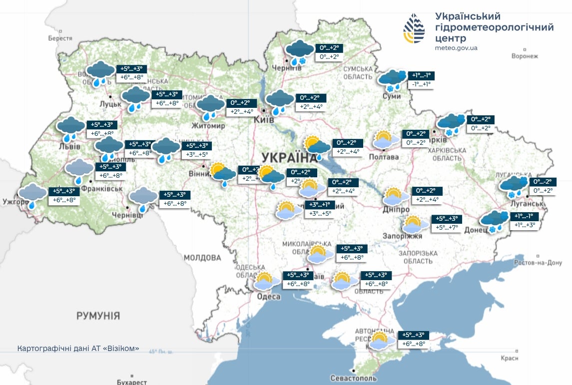 Мокрый снег синоптики прогнозируют в Черниговской, Сумской, Полтавской, Харьковской областях, местами — в Черкасской. На Житомирщине, Киевщине, Винницкой области и на Западе преимущественно дожди. Юг и часть центра завтра пройдут под плотной облачностью, но без существенных осадков, добавляет синоптик Наталья Диденко.