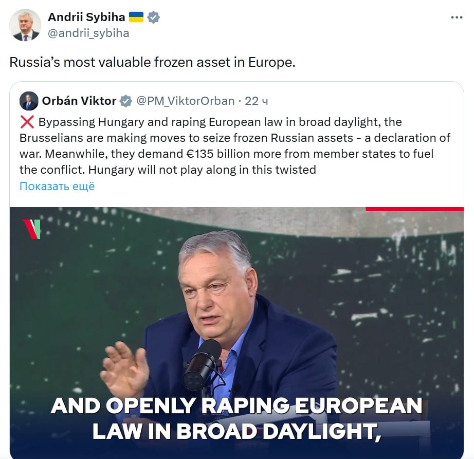 Высказывание Орбана прокомментировал глава МИД Украины Андрей Сибига, который перепостил последнее высказывание премьера Венгрии, сопроводив его лаконичным и ироничным заявлением.