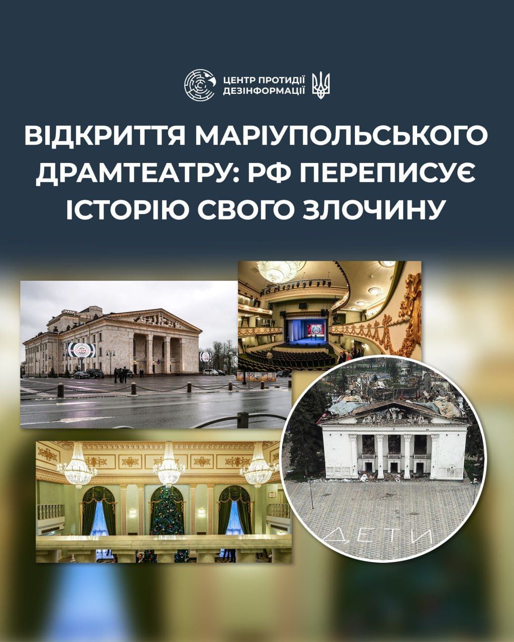 В Мариуполе российские оккупанты устроили "торжественное открытие" драматического театра, который сами же уничтожили авиаударом в марте 2022 года. За фасадом праздника скрывается попытка стереть память о военном преступлении, сообщает Центр противодействия дезинформации.