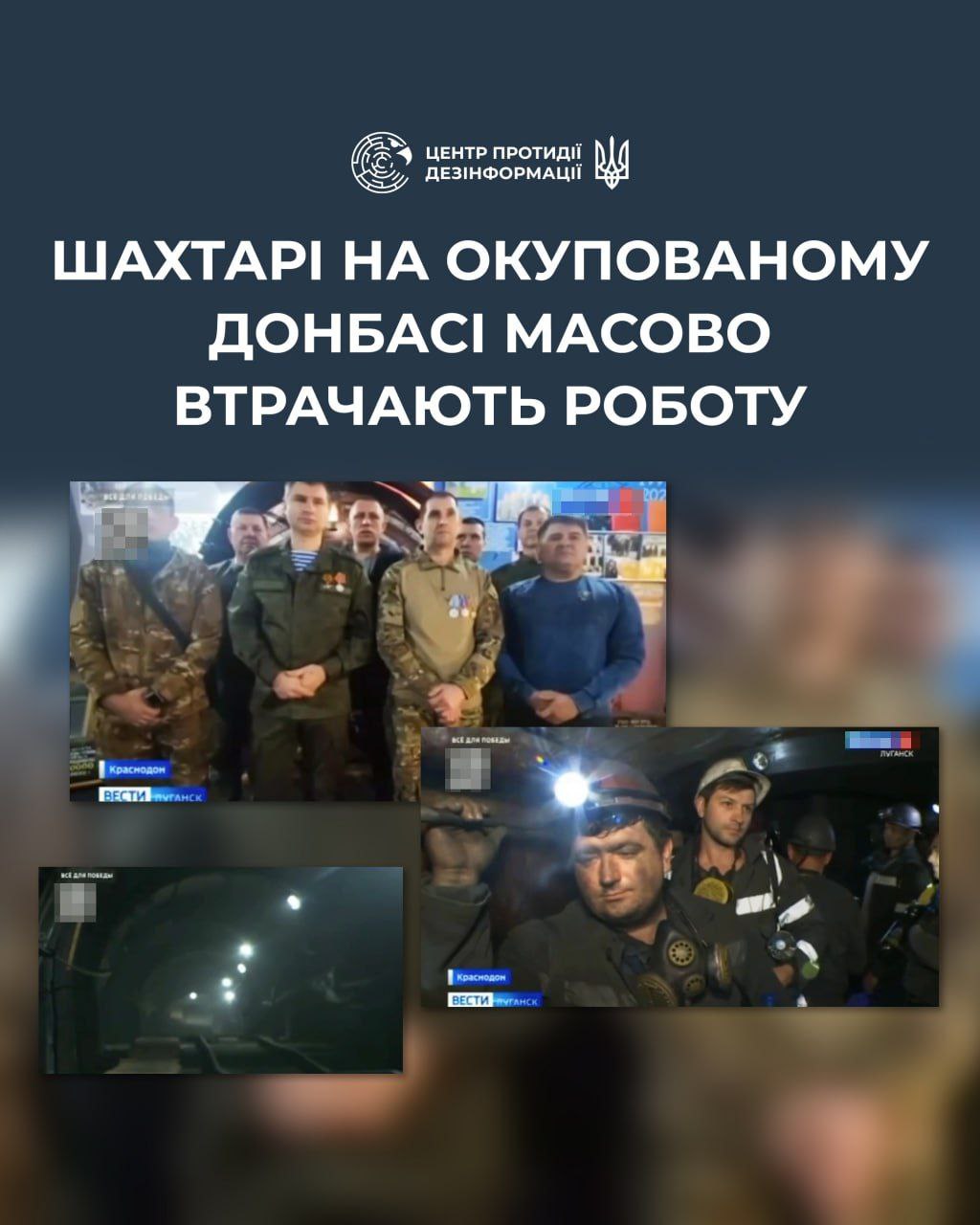 Как сообщает Центр противодействия дезинформации, в Сорокино, оккупированном российскими войсками в 2014 году, шахтеры записали видеообращение к диктатору Путину. В нем они заявили о катастрофическом положении угольной отрасли: добыча угля постоянно падает, предприятия лишены доступа к кредитам, а люди остаются без средств к существованию.