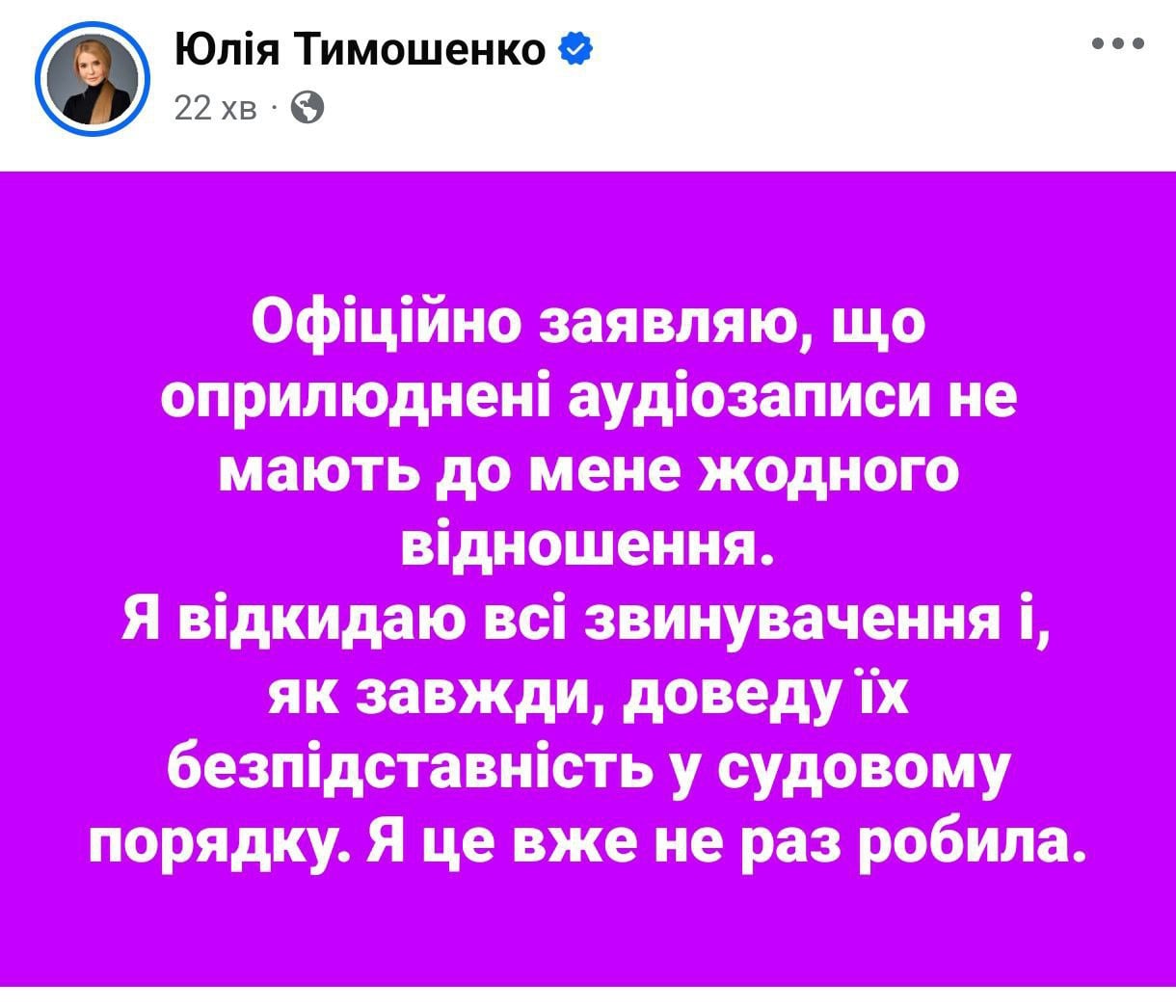Тимошенко заявила, что обнародованные аудиозаписи "не имеют к ней никакого отношения". Она написала, что "отвергает все обвинения" и обещает "доказать их безосновательность в судебном порядке", подчеркнув, что "уже не раз" делала это раньше.